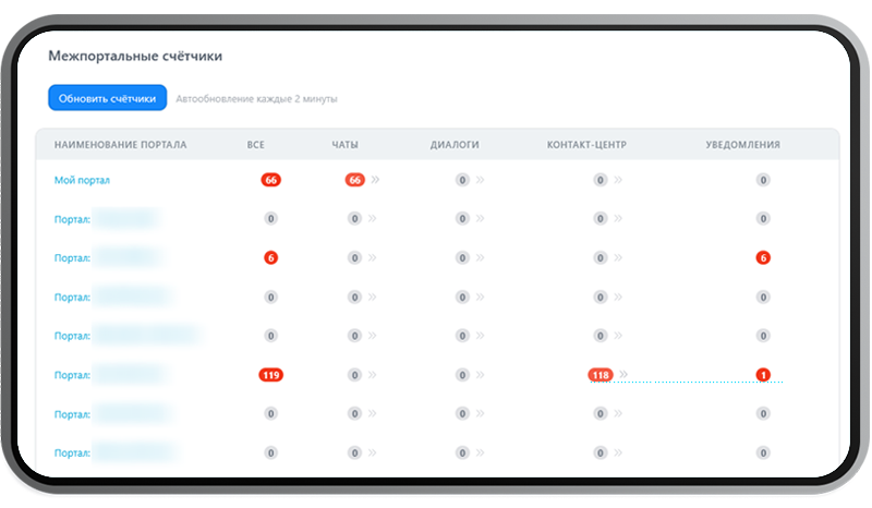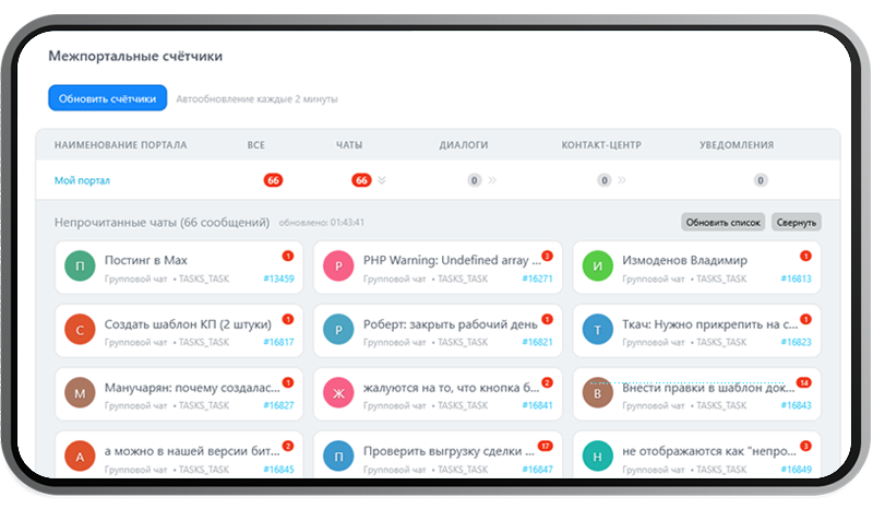 Видите все «счётчики» (непрочитанные сообщения, в т.ч. задачи, диалоги, чаты открытых линий, уведомления) со всех подключённых порталов в одном месте.